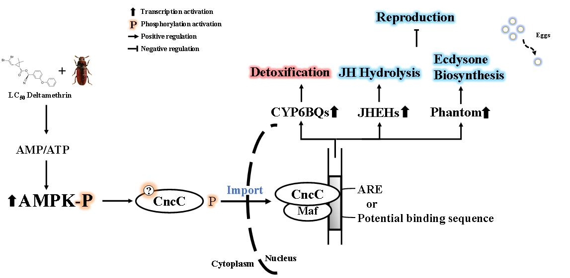 本文研究结果表明,溴氰菊酯诱导的氧化胁迫可以激活AMPK,AMPK通过磷酸化促进CncC入核,导致解毒代谢相关基因的上调表达以及调控生殖的激素水平失衡,表明多效性AMPK/CncC信号通路介导了赤拟谷盗解毒代谢与生殖权衡。审稿专家评论认为该研究为全面认识整个动物界外源化合物及其产生的氧化应激影响生殖的内在机制做出了重要而突出的贡献(“Overall, the studies make an important singular contribution because they establish a mechanistic basis for how xenobiotic and coordinate oxidative stresses can override reproduction across all animal taxa”)。