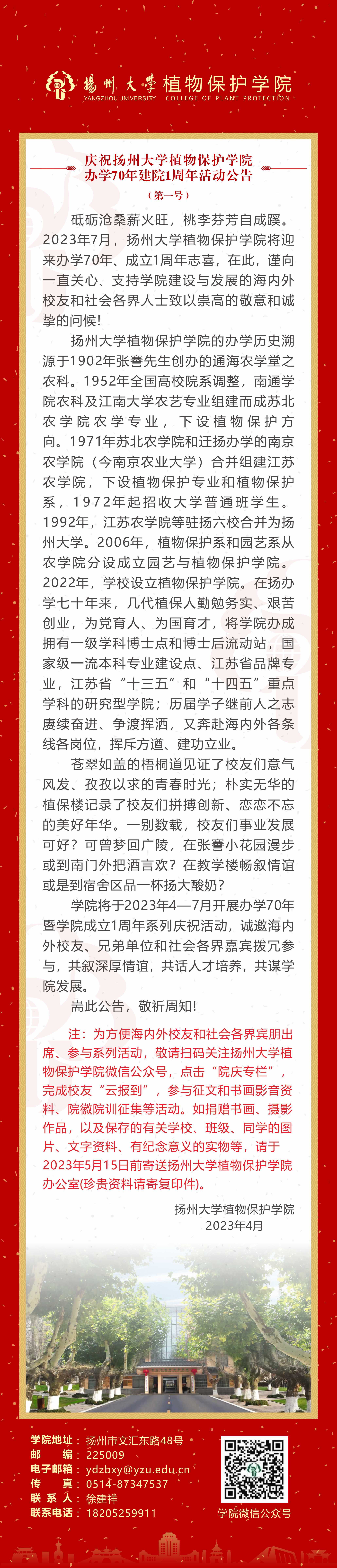 庆祝扬州大学植物保护学院办学70年建院1周年活动公告
