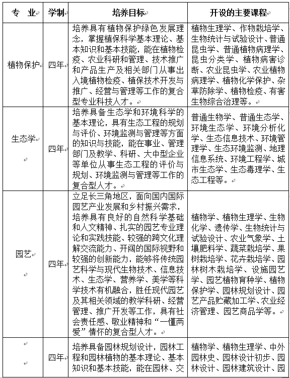 学科专业特色:学院建有植物保护、园艺学博士后流动站,拥有植物保护、园艺学2个一级学科博士学位授权点,以及“植物病理学”、“农业昆虫与害虫防治”、“农药学”、“蔬菜学”、“果树学”、“观赏园艺学”等8个二级学科博士学位授权点。植物保护学科是江苏省“十三五”重点学科,园艺学科是校级重点学科。有植物保护、园艺学一级学科硕士点2个,二级学科硕士点10个。植物保护专业是国家级一流本科专业建设点、全国第一批卓越农林人才教育培养计划复合应用型改革试点专业,江苏省高等学校重点专业,江苏高校品牌专业。园艺专业是全国第一批卓越农林人才教育培养计划复合应用型改革试点专业,江苏省高等学校品牌专业,江苏省高等学校重点专业。园林专业是校级特色专业。注重国际交流与合作,与爱尔兰国立都柏林大学建立了“3+1+1”联合培养机制,与美国、日本、澳大利亚、德国、荷兰等国家建立了良好的合作关系。