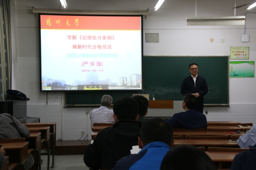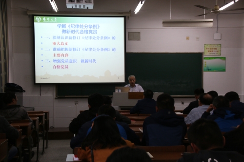 10月17日下午,学院党委邀请校关心下一代工作委员会副主任严华海同志为全院教职工上了一堂题为“学习新《中国共产党纪律处分条例》 做新时代合格党员”的专题党课。此次专题党课由学院党委书记李卫星同志主持,学院全体教职工参加。