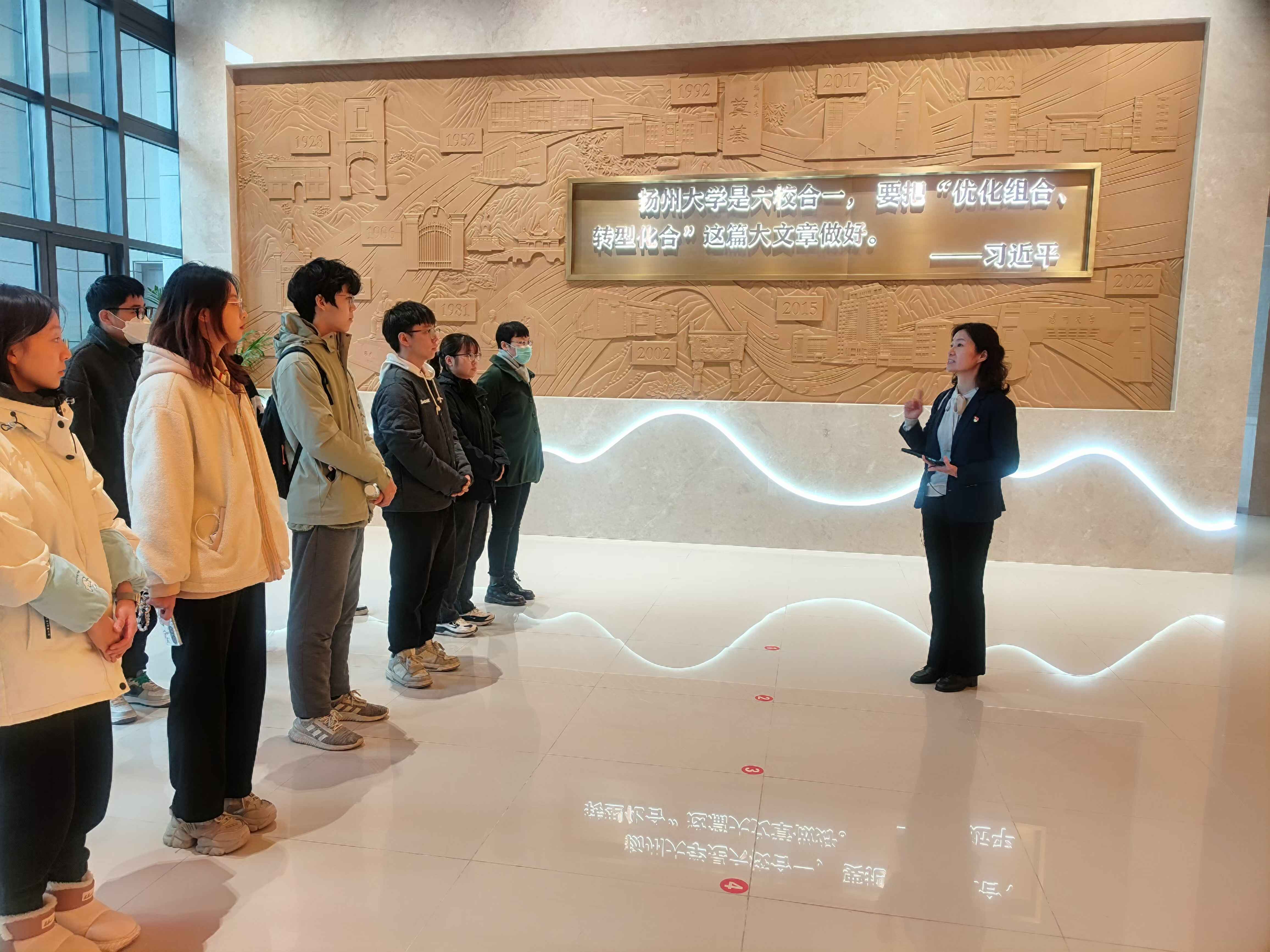 侯书记介绍了校史馆建筑所蕴含深意,六根立柱“六校合一”,三级台阶“三次创业”;组织观看了扬州大学发展史纪录片;从“知校史,通州溯源”“明校情,振翅腾飞”等八个篇章深入讲解了学校的奋进史。侯书记以一个个真实故事,展示了一代代扬大人在践行“坚苦自立”校训中扎根中国大地,厚植家国情怀,勇于挺膺担当,不断为高水平研究型大学的建设出智、出力、出成效。