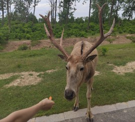 同学们首先乘坐观光车穿过半野生区域近距离观察和投喂麋鹿,之后步行进入圈养区域。聆听着导游的讲解,感受着投喂麋鹿时他们对人类的信任、温顺,欣赏着麋鹿悠闲惬意的生活状态,大家深刻体会到人与自然和谐共处的意义。
