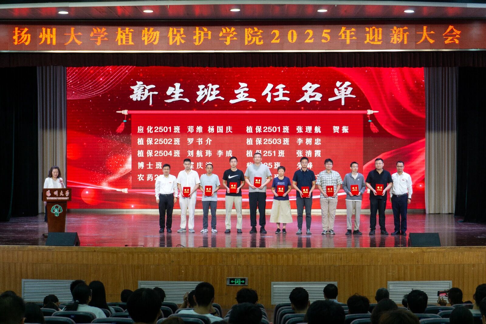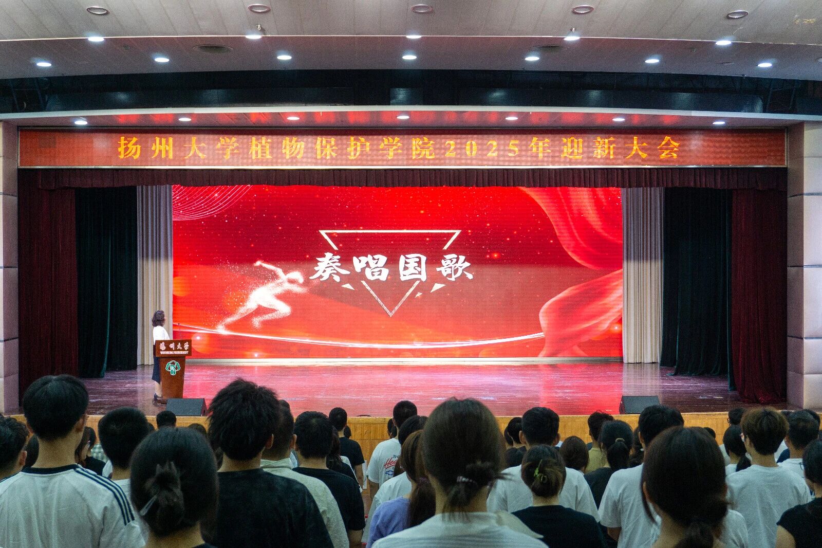 迎新大会在庄严的氛围中隆重拉开帷幕,全体师生肃然起立,齐声高唱国歌,激昂的旋律回荡在整个会场。