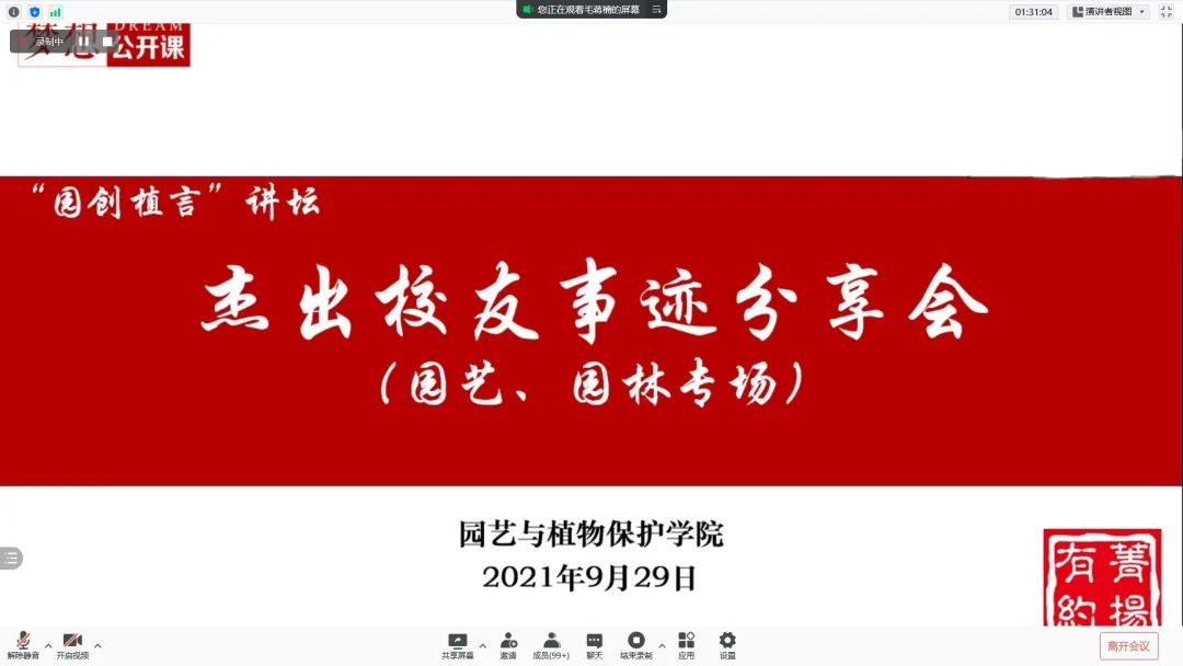 2021年9月29日晚上七点,学院通过线上腾讯会议的形式,为刚入校的大一新生开展了“园创植言”讲坛——杰出校友事迹分享会。会议分植保、生态专场与园艺、园林专场,通过与杰出校友们的交流,同学们也初步对自己进行了三涯规划。