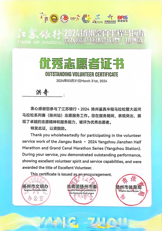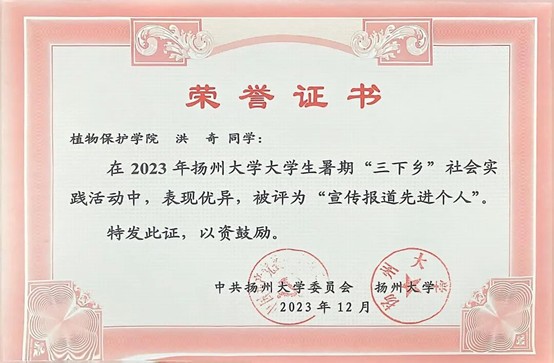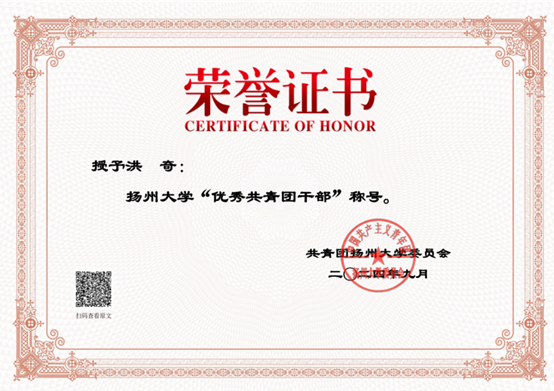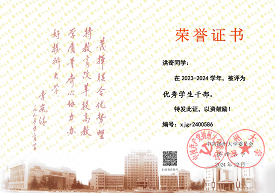 洪奇同学作为一名中共预备党员,始终秉持服务同学、锻炼自我的信念,积极投身各项志愿服务与社会工作,服务时长超过100小时,先后在扬州鉴真半程马拉松赛事、学院七十周年院庆、植物保护学院迎新活动及心理健康日等多项活动中贡献力量,展现出植保学子乐于奉献、勇于担当的精神风貌。同时,作为应化2401班班级助理,他悉心助力新生成长,广受师生好评。在担任院团学中心学工办兼职副主任期间,他协助老师高效完成多项学生工作任务,因表现突出,荣获“优秀学生干部”“优秀共青团干部”等称号。这些经历不仅是对他工作的认可,也让他更加深刻地体悟到责任与奉献的价值内涵。