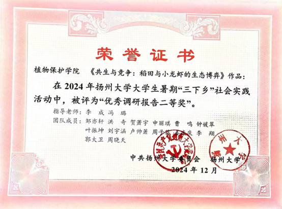 深耕科研的同时,作为植物保护专业的学生,洪奇同学始终坚信“课堂之外,尚有万亩良田”。为将专业所学真正运用于田间地头,他加入农业有害生物调查实践团,利用暑期深入农村与生产基地,系统开展稻田综合种养产业发展现状的调研,让理论知识在实践中得到充分检验。