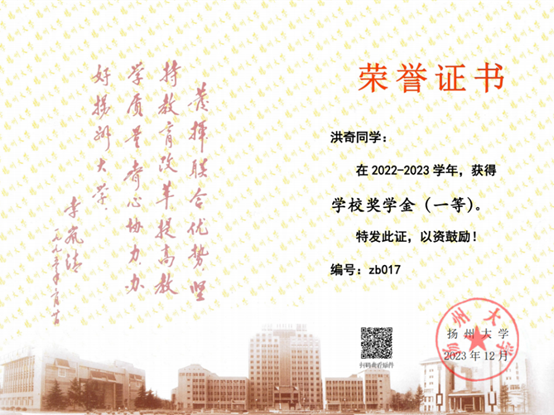洪奇,男,中共预备党员。2004年6月12日出生于江苏盐城。2022年9月始读于扬州大学植物保护学院植物保护专业,曾任院团学中心学工办兼职副主任。曾获学校奖学金(一等)(2次)、第九届全国大学生生命科学竞赛三等奖、扬州大学优秀学生干部、扬州大学优秀共青团干部、扬州大学暑期社会实践先进个人、扬州大学寒假社会实践先进个人、扬州大学优秀心理委员等荣誉。主持国家级大学生创新创业训练计划项目1项,以第一作者发表SCI论文1篇。现已成功保研至中国农业大学。