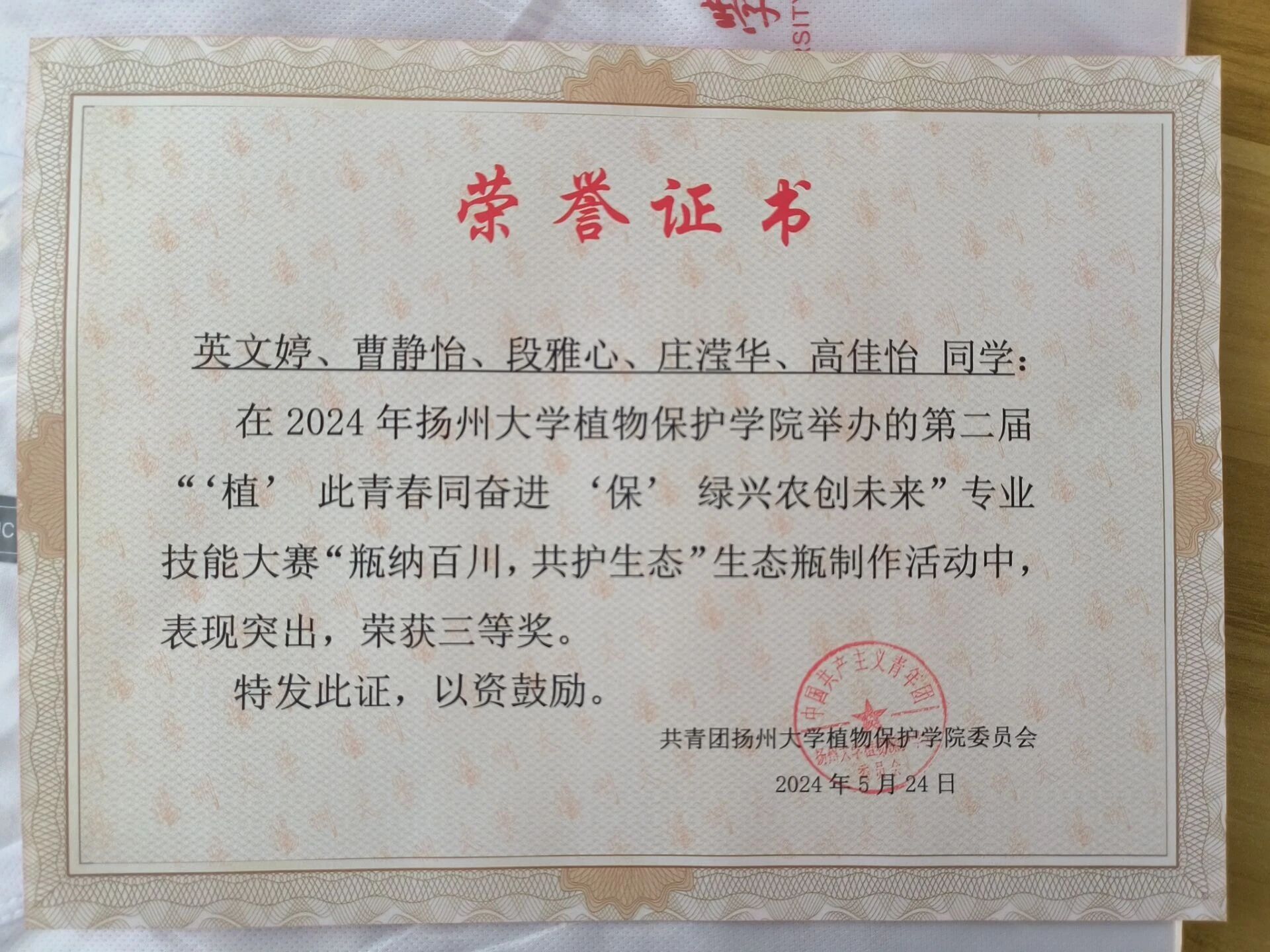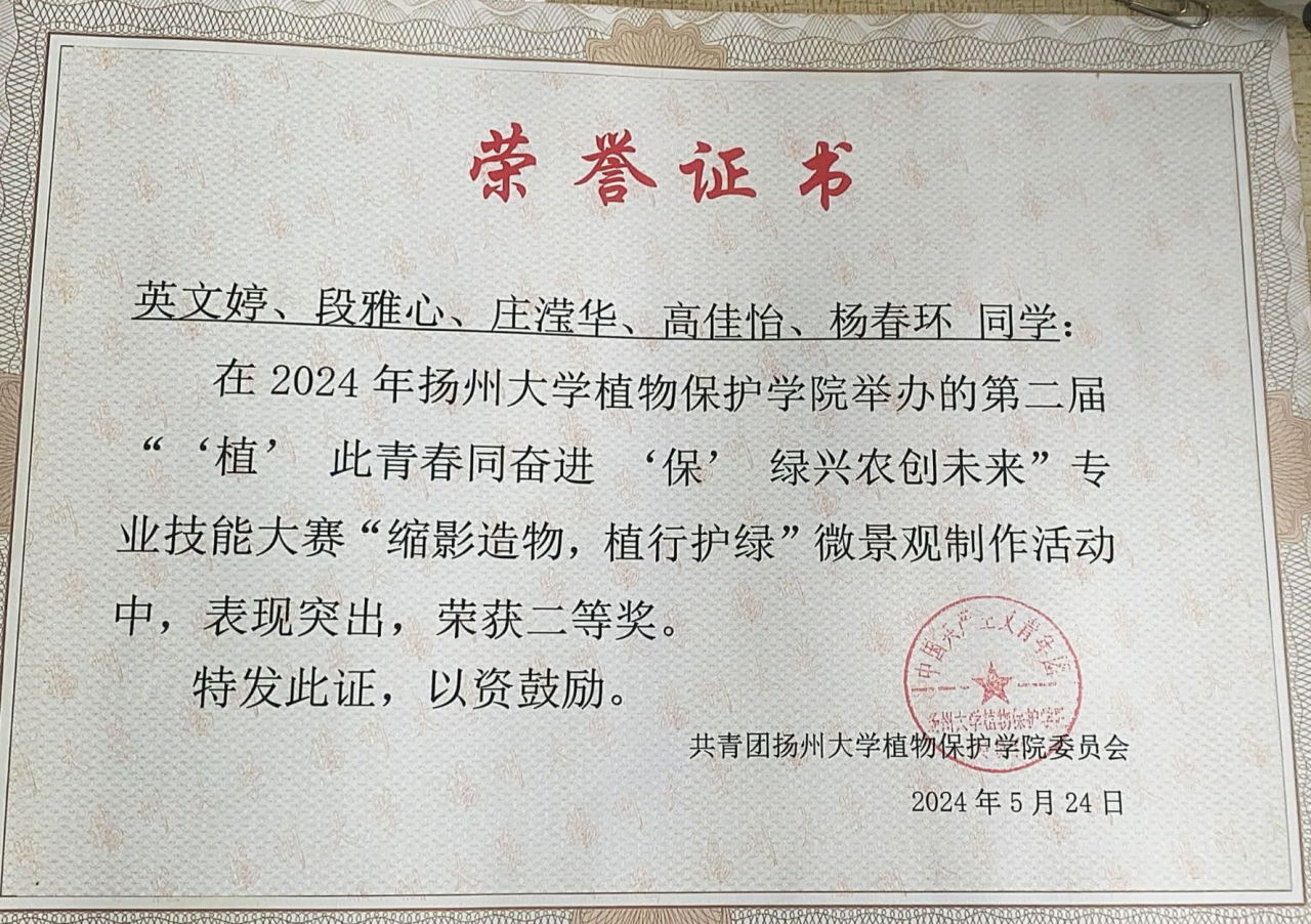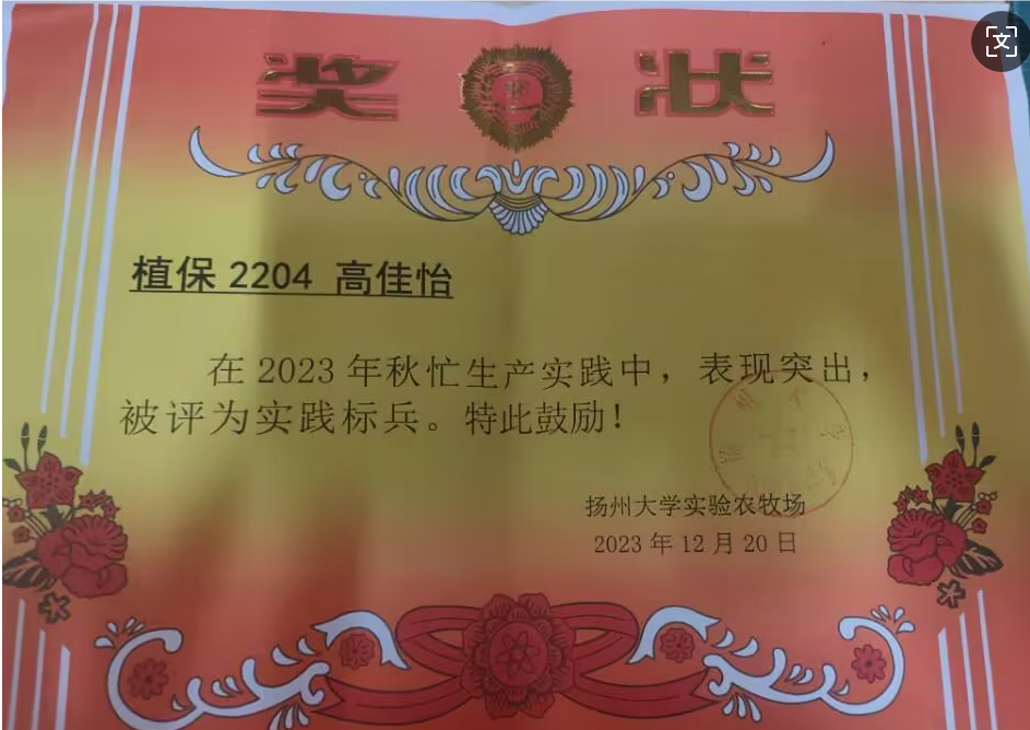 曹静怡,女,中共预备党员,2003年11月8日出生,河北省定州市人,曾任院学生会文联部部长、植物医院社会服务部副部长,现任植保2203班团支书。曾获学校奖学金(一等)、学校奖学金(二等)、先锋奖学金,第十三届“挑战杯”扬州大学大学生课外学术科技作品竞赛二等奖,2023年暑期社会实践校优秀团队、2024年暑期社会实践校优秀团队等荣誉。现已成功保研至南京农业大学。