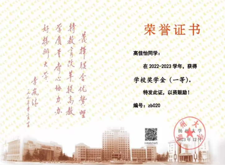 高佳怡,女,中共预备党员,江苏无锡人,于2022年9月始读于扬州大学植物保护学院植物保护专业。曾任院学生会生活权益部部长、植保2204班团支书。曾获学校奖学金(一等)、学校奖学金(二等),校优秀共青团员、校暑期社会实践优秀团队等荣誉。现已成功保研至扬州大学植物保护学院。
