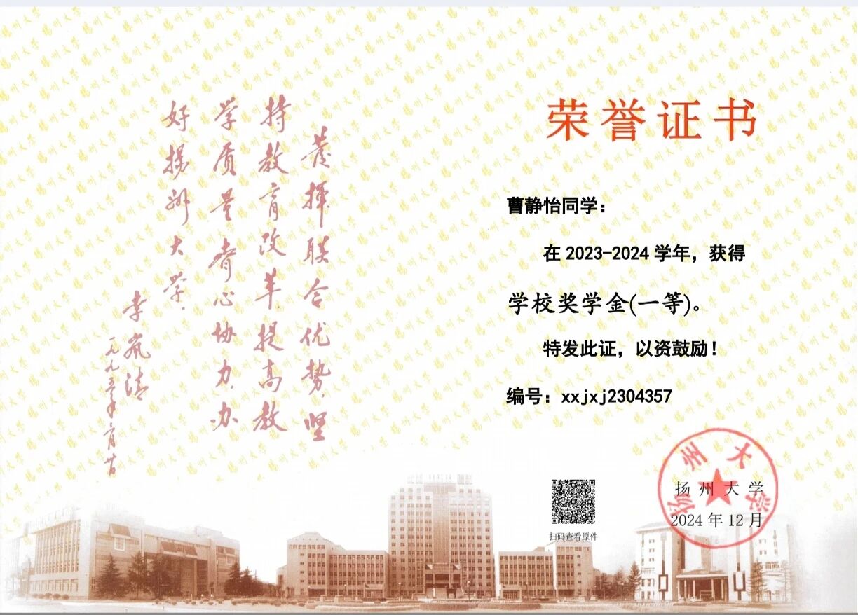 自入学以来,曹静怡同学始终以踏实之心求学,以热忱之心待人,在探索与沉淀中不断成长。学业上,她勤勉专注,专业成绩稳居年级前列,多次荣获校奖学金等荣誉;同时积极投身学科竞赛,在多项专业比赛中斩获佳绩,以赛促学,不断夯实专业基础。