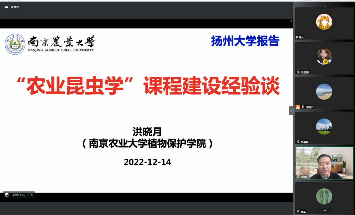 2022年12月14日下午,植物保护学院组织的2022年本科教学节之名师大讲堂活动,邀请南京农业大学洪晓月教授,在腾讯会议线上为我院全体教职工做题为“农业昆虫学课程建设经验谈”的主旨报告,会议由植物保护学院杨国庆院长主持。