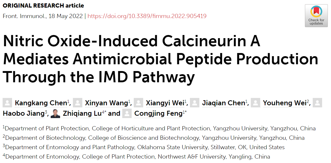 近日,我院冯从经教授课题组在免疫学著名期刊Frontiers in Immunology (中科院二区Top期刊, IF=7.561)上发表题为Nitric Oxide-Induced Calcineurin A Mediates Antimicrobial Peptide Production Through the IMD Pathway的研究论文。