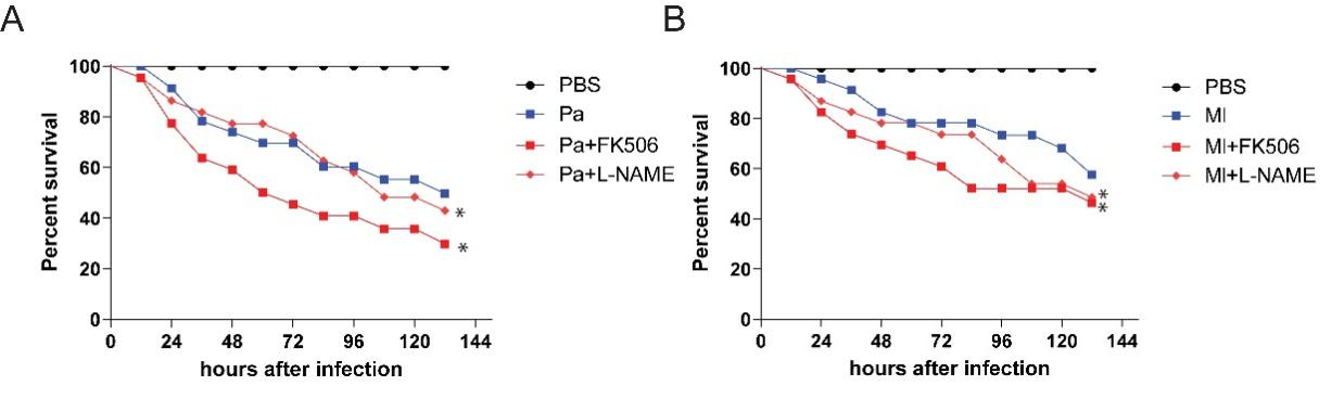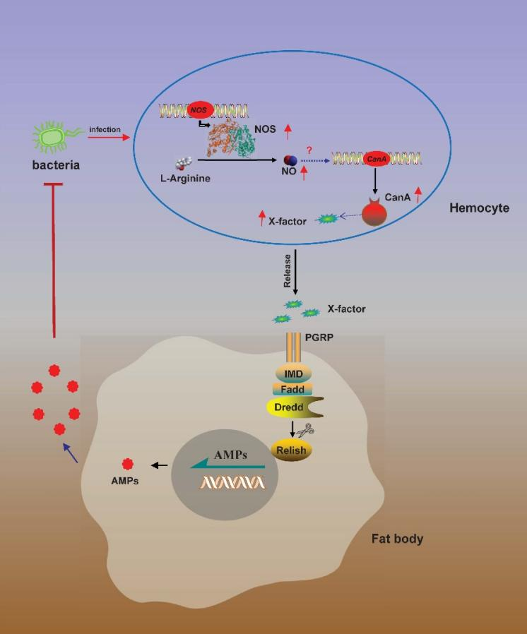 活性氧(reactive oxygen species, ROS)反应和抗菌肽(antimicrobial peptides, AMPs)反应是昆虫天然免疫系统中的重要防线。一氧化氮(nitric oxide, NO)是一种早期的ROS反应关键分子,而合成AMPs 是晚期的免疫反应。但过度的免疫则会造成机体氧化损伤和不必要的能量消耗。因此,昆虫的这两种免疫反应间可能存在着一种潜在的分子通讯机制,以保证昆虫高效快速地产生免疫应答。该研究以重要的粮食作物害虫亚洲玉米螟为模型,研究昆虫ROS 关键分子NO 调控AMPs 合成的分子机理。发现抑制一氧化氮合成酶 (NOS)或钙调磷酸酶A (CanA) 活性可显著降低细菌感染后幼虫的存活率。细菌感染和外源NO供体可上调虫体内NOS的表达、增加NO浓度和AMPs的合成。利用果蝇S2细胞进一步验证发现细菌感染可引发NOS上调表达, CanA可接收NO信号进而通过IMD信号通路激活抗菌肽的表达。而RNAi阻断NOS、CanA或IMD途径关键基因的表达或抑制剂减弱NOS或CanA活性可显著减弱抗菌肽的表达。这些结果表明活性氧分子NO诱导的钙调磷酸酶A可通过IMD信号途径调控抗菌肽的合成,揭示了活性氧分子NO参与调控昆虫抗菌肽合成的分子机理。