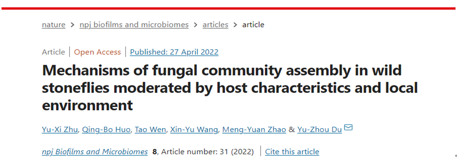 2022年4月27日,Nature子刊npj Biofilms and Microbiomes(IF5year: 8.97)发表了我院杜予州教授团队题为“Mechanisms of fungal community assembly in wild stoneflies moderated by host characteristics and local environment”的研究论文,该研究系统揭示了襀翅目昆虫(襀翅虫或石蝇)真菌群落的构建机制。