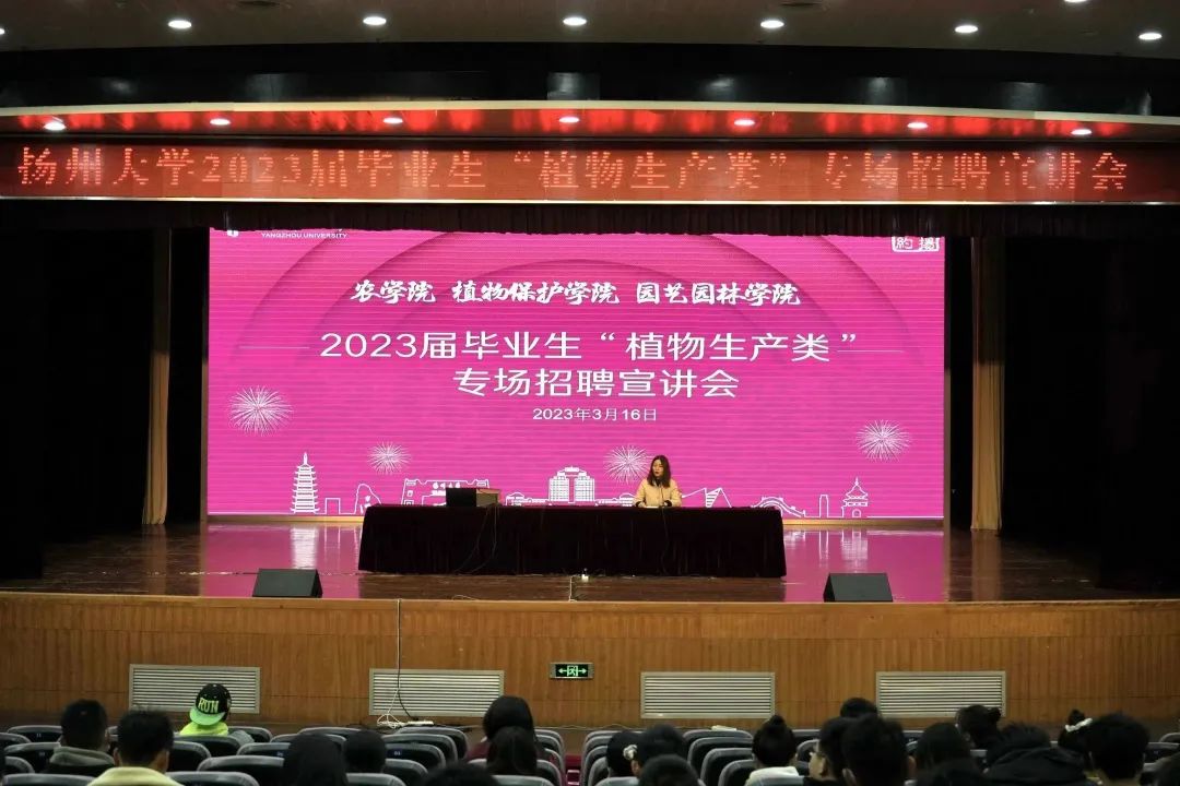 3月16日,由植物保护学院、农学院、园艺园林学院共同举办的扬州大学2023届毕业生“植物生产类”专场招聘宣讲会于荷花池校区大学生活动中心三楼小剧场成功举办。