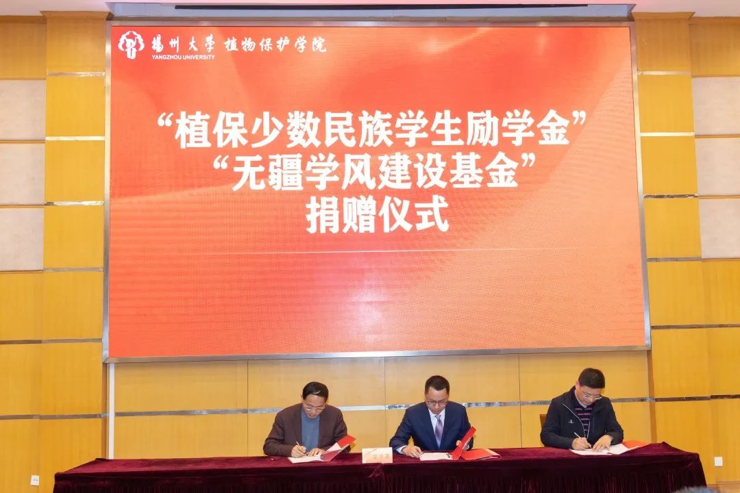 杨国庆院长分别与93届校友纪志君、退休教师杭三保、99届校友徐俊鸿签订了“思源基金”“植保少数民族学生励学金”“无疆学风建设基金”等捐赠协议。