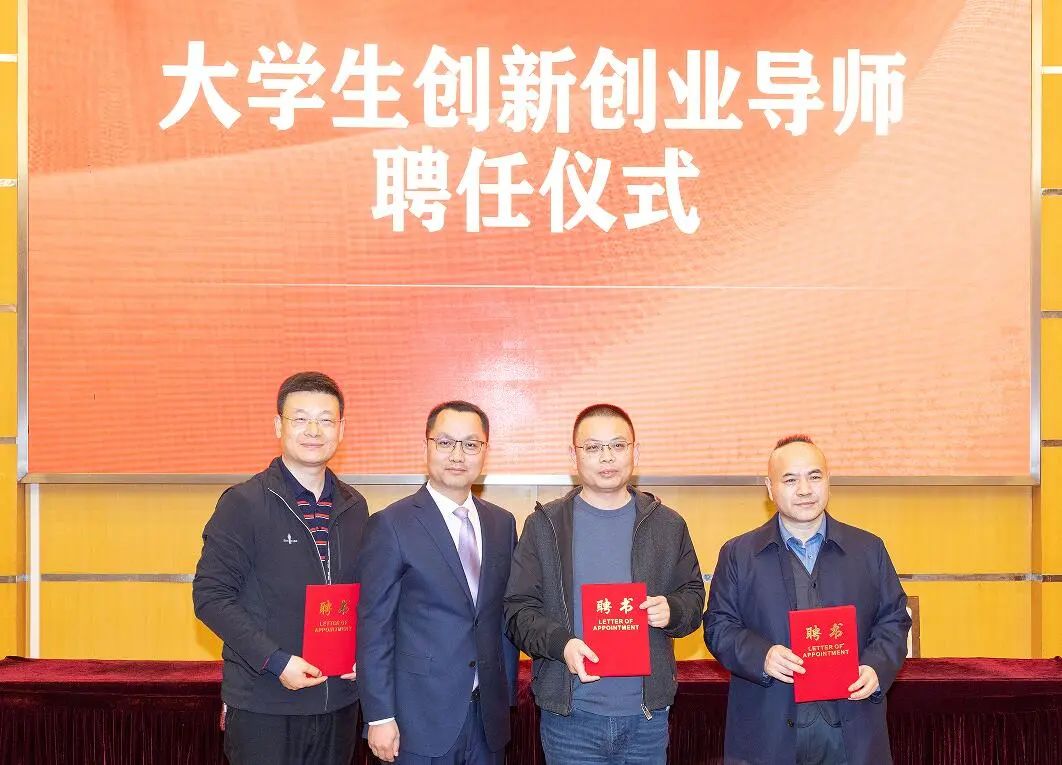 杭三保老师受聘担任学院关工委副主任,纪志君、陈一波、徐俊鸿三位校友受聘担任大学生创新创业导师。
