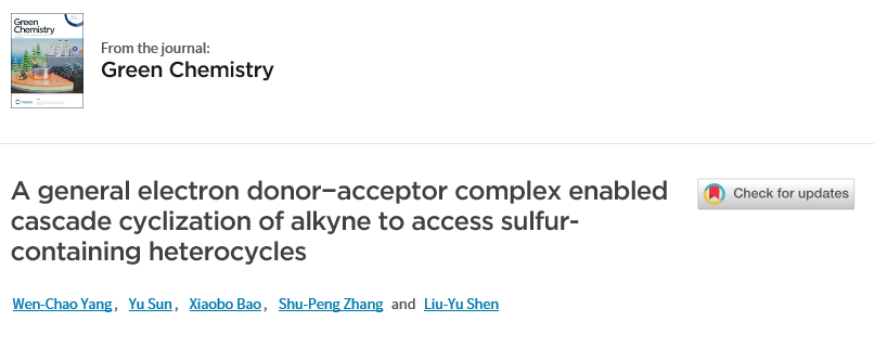近日,绿色和可持续科技领域的国际权威期刊Green Chemistry(IF=11.034)在线发表了扬州大学植物保护学院绿色农药创制与应用团队青年教师杨文超博士完成的题为“A general electron donor−acceptor complex enabled cascade cyclization of alkyne to access sulfur-containing heterocycles”的研究论文。该研究发展了可见光驱动和电子给-受体(EDA)复合物促进芳基亚磺酸与含有炔烃的硫代苯甲醚衍生物的串联环化反应,实现了一种含硫杂环化合物的绿色、便捷的合成方法。