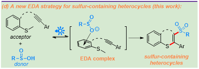 当今社会人类面临能源枯竭、环境污染及可持续发展等方面的问题,这势必对有机合成化学工作者提出了更高的要求。探索与发展具有原子经济性、步骤经济性、环境友好、高效、精准的有机合成新方法是现代有机化学的研究目标之一。进入新世纪以来,合成工作者对使用可见光触发的有机化学反应十分着迷,因为有机光合成具有绿色环保、原子经济性高、低能耗等特点。然而,由于大多数有机分子不能直接吸收可见光,因而该类反应常常需要外加光催化剂。光催化剂的使用往往可以显著地提高转化的效率,但这也给反应后的纯化处理带来了困难。近年来,在无光催化剂的条件下,引入可见光驱动的电子给体-受体(EDA)复合物可以高效地实现有机转化,为光化学体系下的绿色有机合成注入了新的活力。另一方面含砜杂环广泛存在于功能物质、农药和重要的生物活性化合物中,人们在这类化合物库的构建上发展了一系列合成策略。然后,很少有合成工作者关注可见光驱动和电子给-受体(EDA)复合物促进不饱和烃的串联环化构建含砜杂环化合物。基于此,杨文超博士通过在芳环中引入甲硫基官能团形成缺电子中心,同时以硫原子作为反应活性自由基中间体的接受体构建硫杂环。该策略的优势在于:(1) 反应底物廉价易得,底物兼容性好,操作简便;(2) 无需依赖过渡金属催化剂、配体、光催化剂和氧化剂,反应条件温和,对环境友好,符合绿色化学的发展需求。