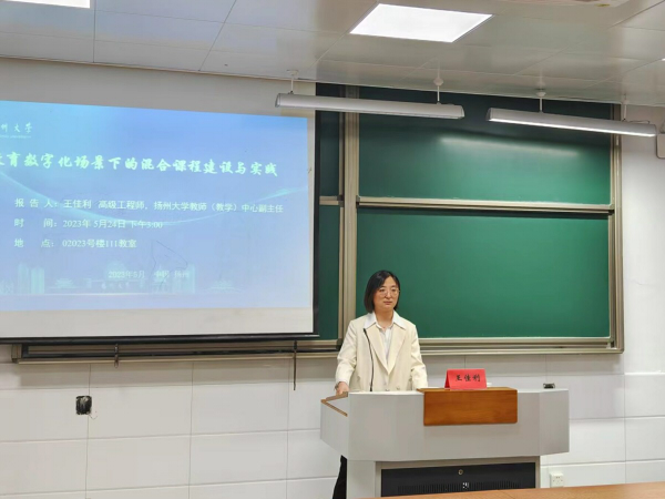 5月24日下午,我院在文汇路校区23号楼111教室举办教师教学能力提升专题培训会,本次培训会邀请到扬州大学教务处教师(教学)中心副主任王佳利老师做了题为“教育数字化场景下的混合课程建设与实践”的专题报告。