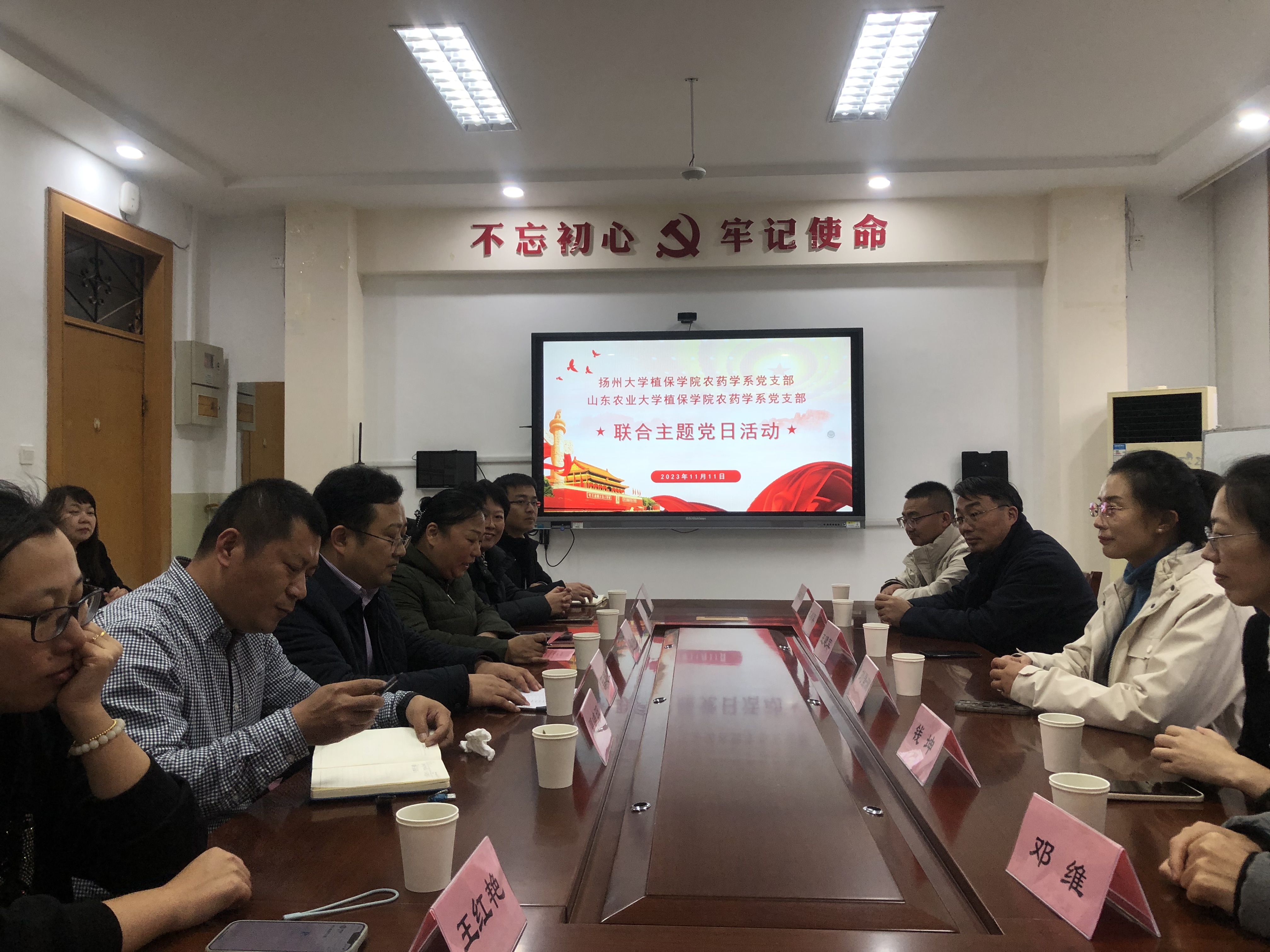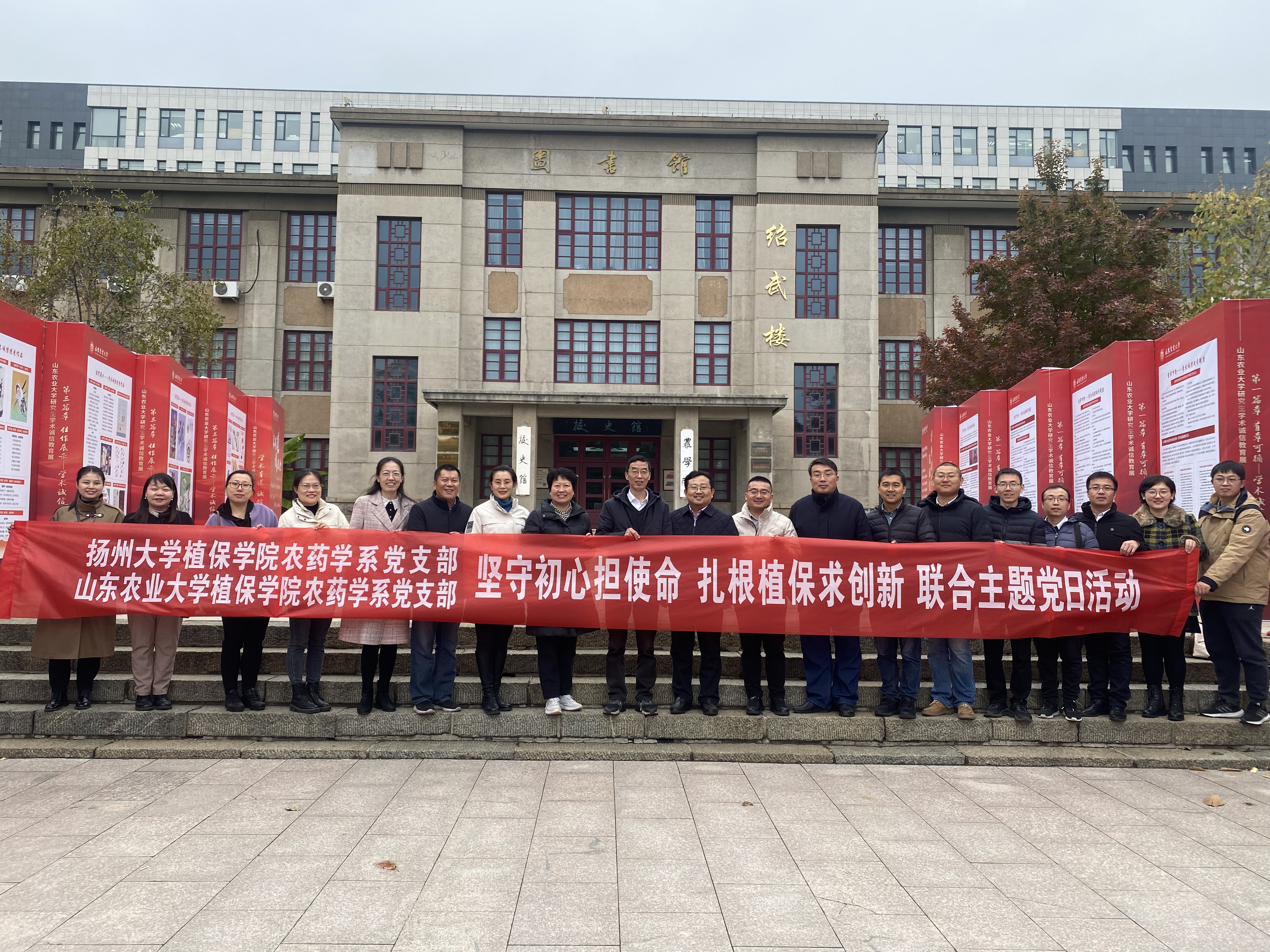 为深入学习贯彻党的二十大精神,落实新时代党的建设总要求,进一步提升党支部标准化、规范化建设水平,推动支部青年教师党性修养和业务能力“双促进、双提升”,2023年11月11日,我院农药学系党支部在副院长刘景澜教授和支部书记王建军教授的带领下赴山东省泰安市与山东农业大学植物保护学院农药学系党支部联合开展“坚守初心担使命、扎根植保求创新”主题党日活动。山东农业大学植物保护学院党委副书记刘敏、副院长薛超彬教授、农药学系党支部书记夏晓明教授、我院农药学系系主任陈小军教授以及两院20余名教师党员参加了本次活动。
