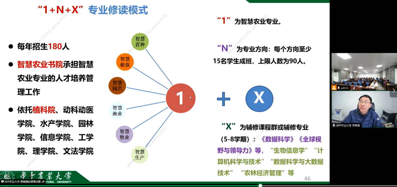 罗朝喜教授从介绍植物科学技术学院的发展历程开始本次报告,首先结合新农科建设的时代背景与历史使命,以植物科技学院本科专业建设实践为切入点,着重分析如何通过一流课程、新形态教材、“同、厚、新、深”课程思政等建设来实现新农科专业建设的探索历程。其次,他通过典型案例介绍理论实践教学模式的改革创新,有效规划如何推进学生创新能力与实践技能的培养流程。最后,他还深入介绍如何将“价值引领、通专融合、交叉培养、实践创新、全球视野”原则融合在新专业“智慧农业”建设的全过程,并分享新农科人才培养模式创新的有益经验。