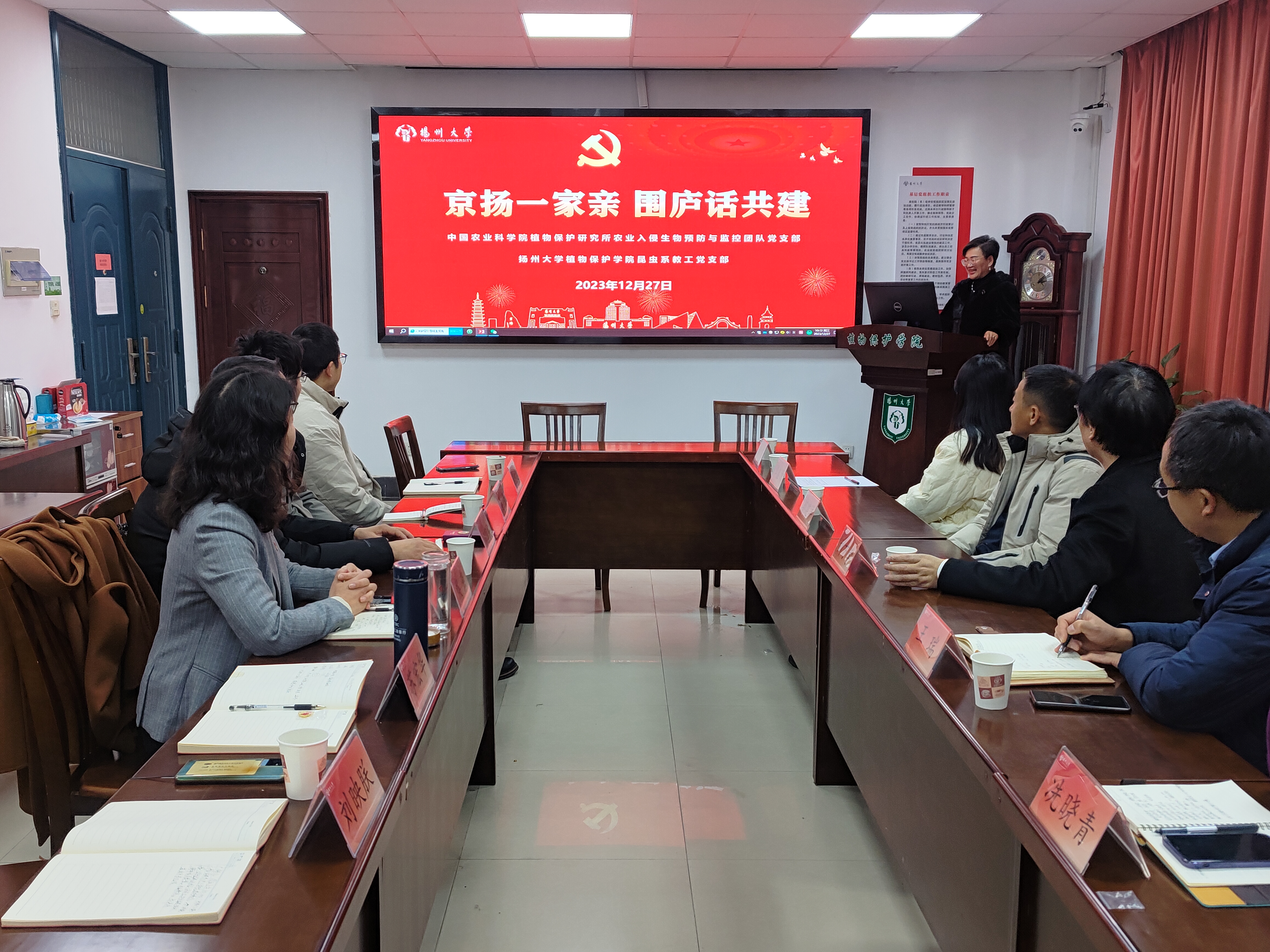 会上,院党委书记侯燕向中国农业科学院植物保护研究所农业入侵生物预防与监控团队党支部一行人到来表示欢迎,侯书记介绍了学院支部设置及建设概况,就“融合式”党建建设思路及成效进行展示。中国农业科学院植物保护研究所农业入侵生物预防与监控团队党支部书记刘万学介绍了支部成员情况,支部科学研究与社会服务方面的相关成绩。院长杨国庆围绕学院发展历程,学院发展现状,师生发展质态作出详细介绍。昆虫学系党支部书记苏宏华以“京扬一家亲 围炉话共建”为题,围绕支部科学研究、学术研讨、人才培养、科普工作以及送科技下乡方面开展的共建工作进行全方位展示。