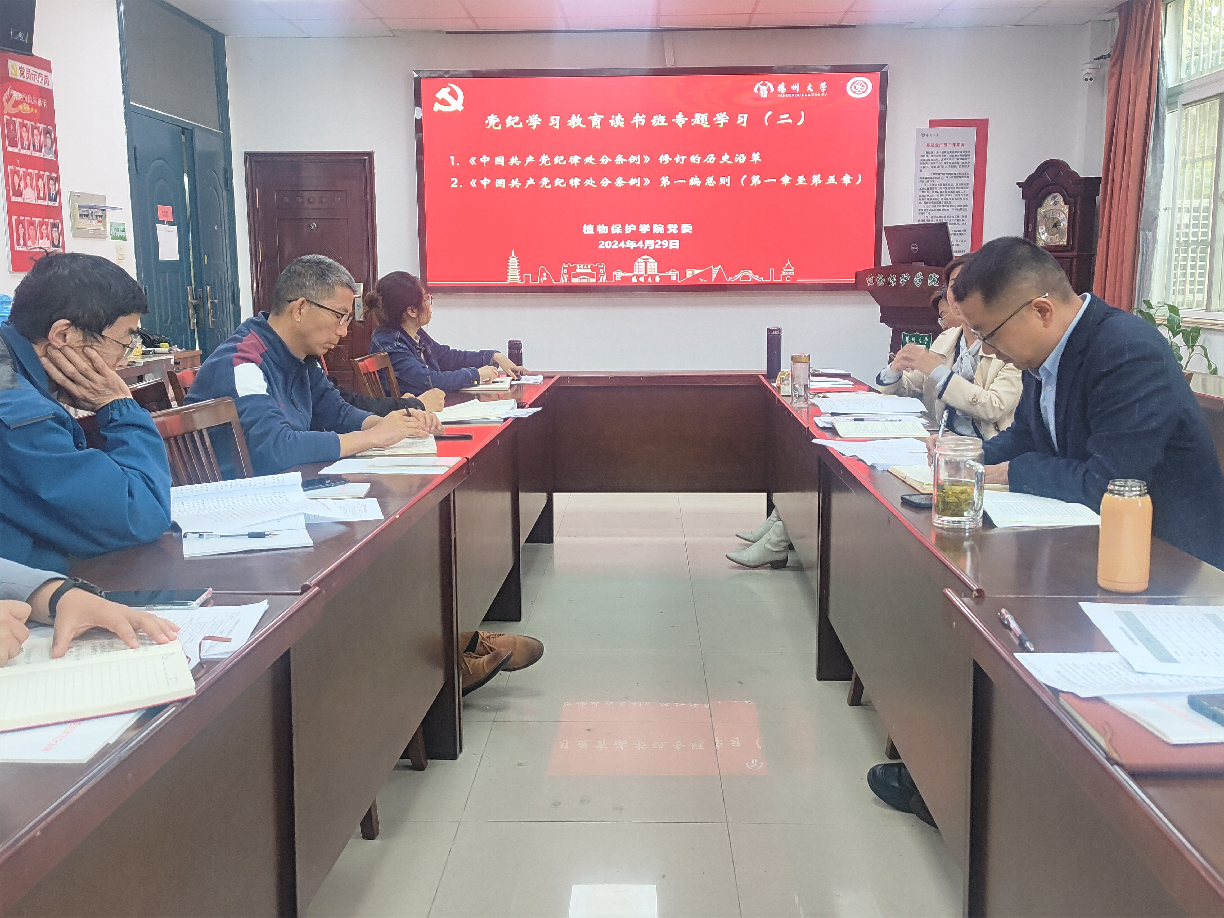 4月29日,学院在107会议室举行党委理论中心组党纪学习教育专题读书班集体学习会,院党委书记侯燕主持,院党委理论中心组、各党支部书记、党员骨干教师参会。