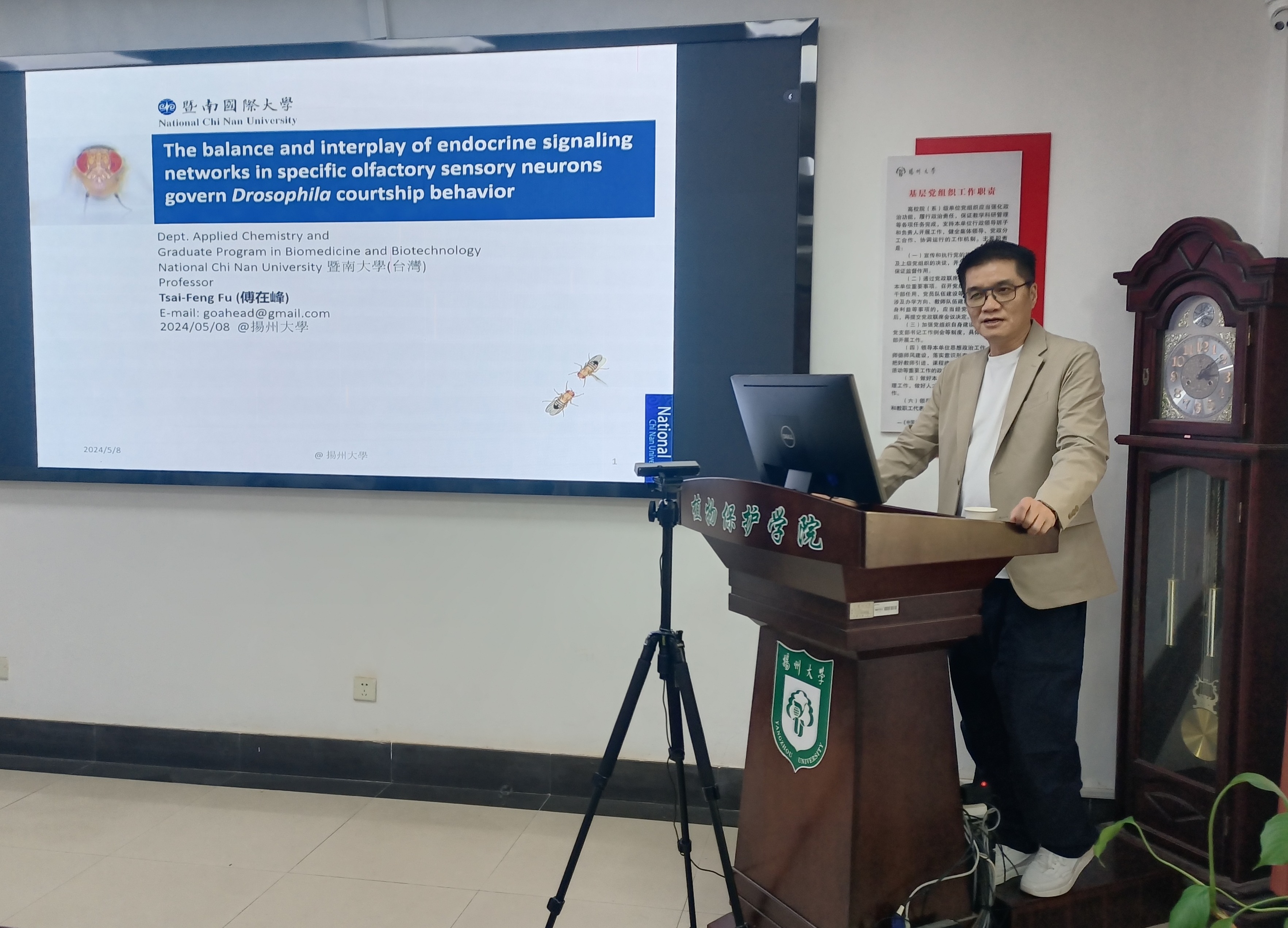 5月8日植物保护学院“保绿兴农”学术大讲堂系列讲座于学院107会议室举行,台湾暨南国际大学应用化学系傅在峰教授应邀带来了一场题为“内分泌信号在嗅觉感觉神经元中的平衡和相互作用控制果蝇求偶行为”的学术报告。报告会由刘景澜副院长主持,学院部分师生聆听了此次报告会。