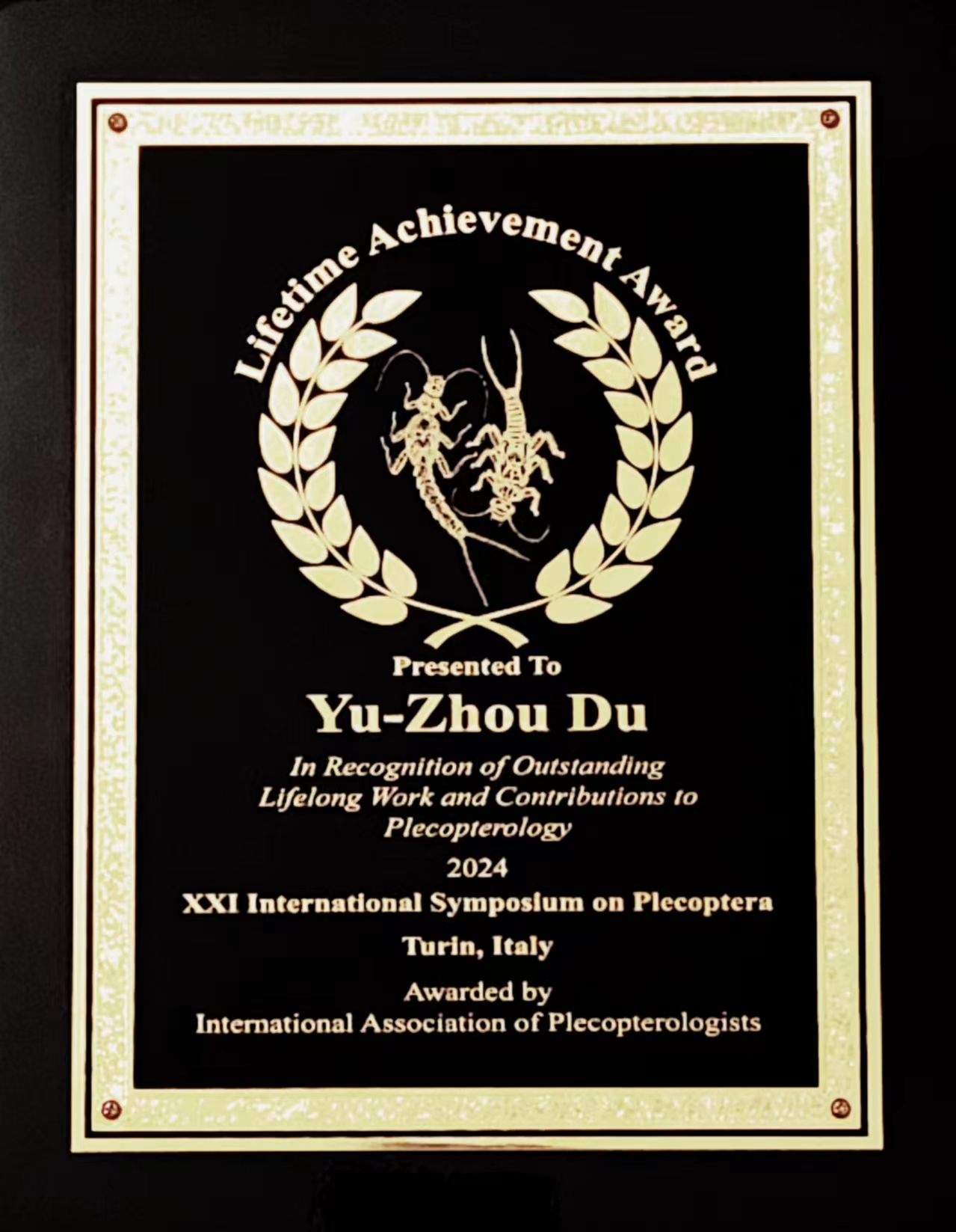 7月25日,在意大利都灵市召开的第十七届国际蜉蝣大会和第二十二届国际襀翅目昆虫学术研讨会联合大会上,国际襀翅学家协会因杜予州教授长期坚持昆虫学研究以及对襀翅学的杰出贡献,决定授予他“终身成就奖”,并由协会主席,挪威奥斯陆大学教授Brittain, J.E.亲自为其颁发。