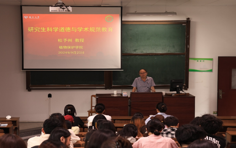9月25日下午,我院在荷花池主楼E124开展研究生科学道德与学术规范教育。学院杜予州教授主讲。副院长刘景澜主持了此次会议。