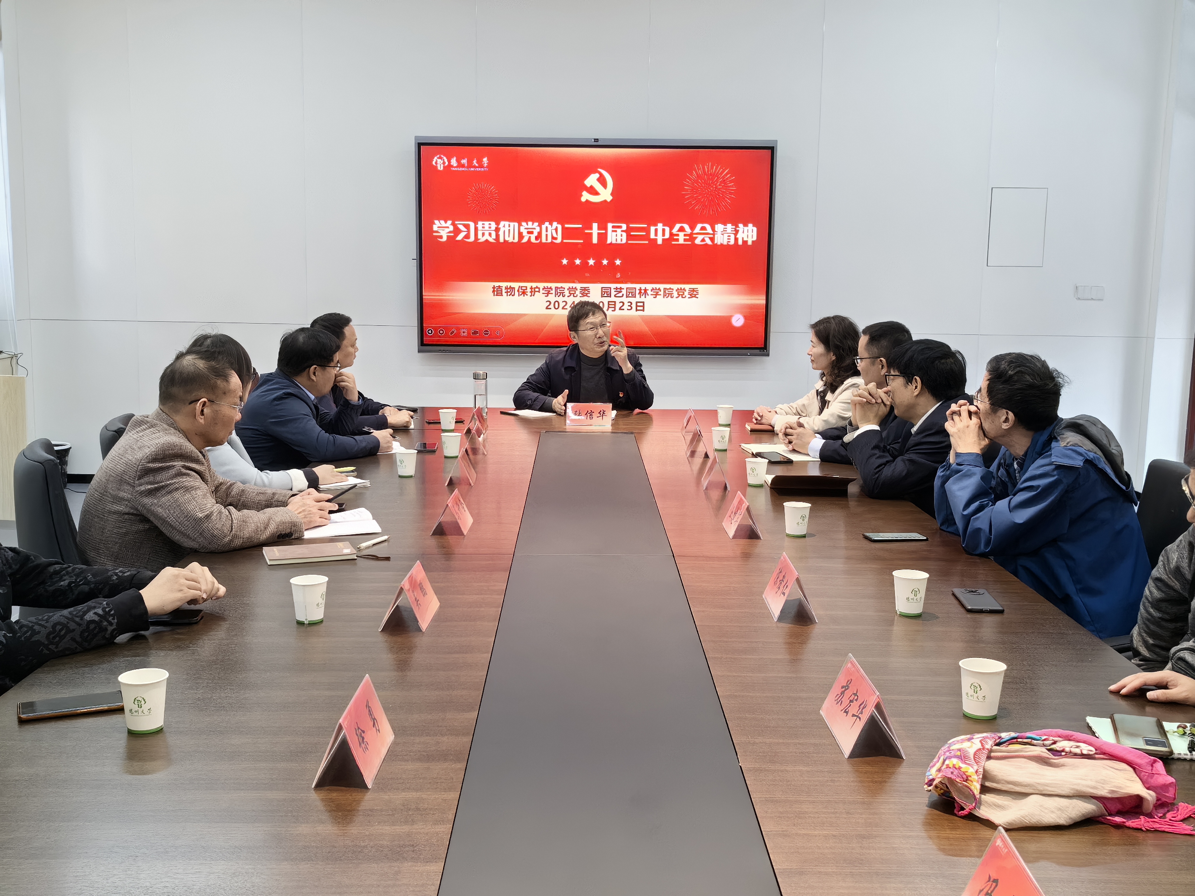 10月23日,学院在文汇路校区校史馆开展党的二十届三中全会精神专题学习。校党委常委、宣传部部长张信华应邀参会并做专题报告。学院与园艺园林学院党委班子成员、师生党支部书记参加报告会。