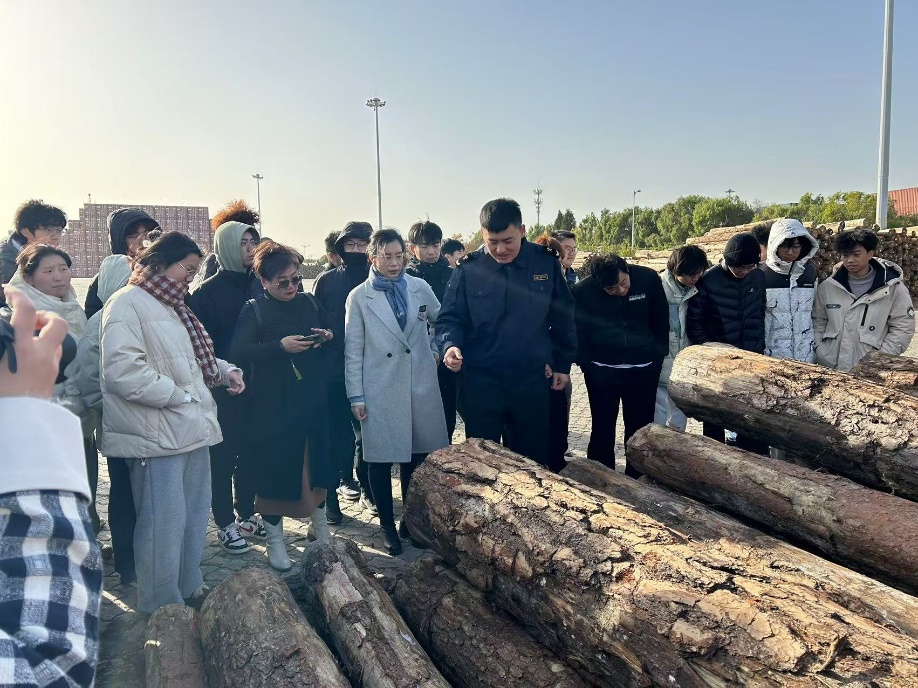 师生们首先来到了扬州远扬国际码头。海关工作人员高飒详细讲解了如何检疫与运输外来树木——从开箱直接检查到抽样进行室内镜检,每一步都至关重要,此举可以防止危险性病虫害的传播,保护农林生产安全和国家生物安全。