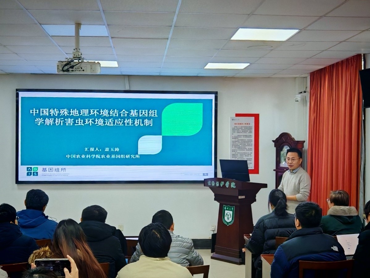 12月27日上午,我院第二十三期保绿兴农学术大讲堂在学院107会议室举行。中国农业科学院深圳农业基因组研究所萧玉涛研究员与江苏省农业科学院植物保护研究所纪锐研究员分别为师生们带来了题为“中国特殊地理环境结合基因组学解析害虫环境适应性机制”与“稻飞虱唾液和产卵分泌物调控水稻防御的机制”的学术报告。报告会由副院长刘景澜教授主持。