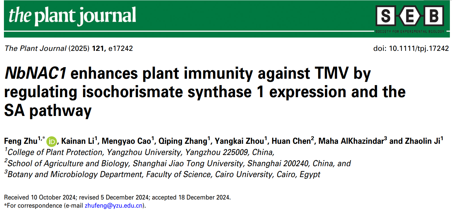 近日,我院朱峰教授课题组在国际知名学术期刊The Plant Journal(中科院1区TOP期刊,五年影响因子7.1)在线发表了题为“NbNAC1 enhances plant immunity against TMV by regulating isochorismate synthase 1 expression and the SA pathway”的研究论文。该研究揭示了转录因子NbNAC1直接调控SA生物合成应答病毒侵染的分子机制。