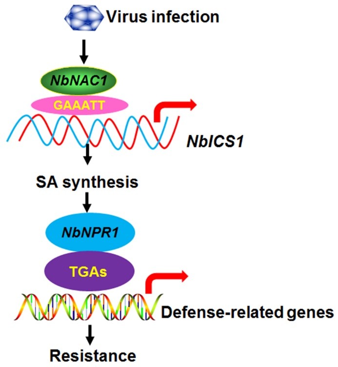 图1NbNAC1调控植物防御信号应答病毒侵染的工作模型