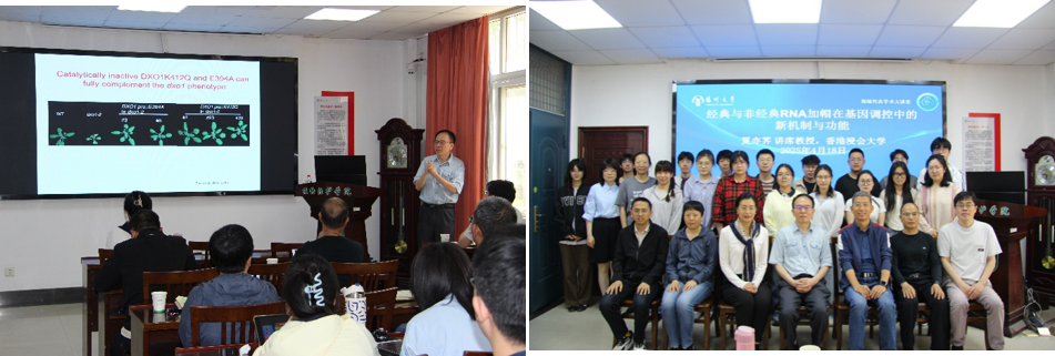 在交流期间,夏亦荠教授以"经典与非经典RNA加帽在基因调控中的新机制与功能"为题,系统阐释其团队在mRNA加帽机制研究中的突破性进展。报告从RNA加帽酶的发现与证实的角度切入,揭示了经典和新型RNA加帽的新机制与功能,吸引了植保学院、农学院等院系50余名师生参与。提问环节中,与会师生就RNA加帽功能及其动态调控机制等前沿问题与夏教授展开深度探讨,现场学术氛围热烈。