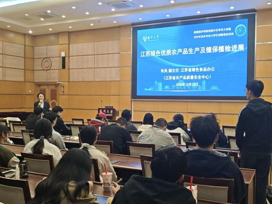 2025年10月22日,江苏省绿色食品办公室副主任朱凤在荷花池校区教学主楼多功能厅,为学院师生带来了一场主题为《江苏绿色优质农产品生产及植保植检进展》的精彩专题报告。