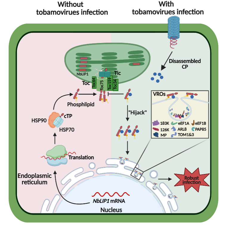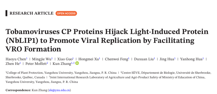 2025年12月16日,我院张坤副教授团队与加拿大舍布鲁克大学Peter Moffett教授合作,在国际权威期刊《Plant Biotechnology Journal》在线发表题为“Tobamoviruses CP Proteins Hijack Light-Induced Protein (NbLIP1) to Promote Viral Replication by Facilitating VRO Formation”的研究论文。该研究首次揭示了烟草花叶病毒属病毒利用外壳蛋白(CP)“劫持”宿主光诱导蛋白NbLIP1,协助构建病毒复制细胞器(VROs)的全新机制。