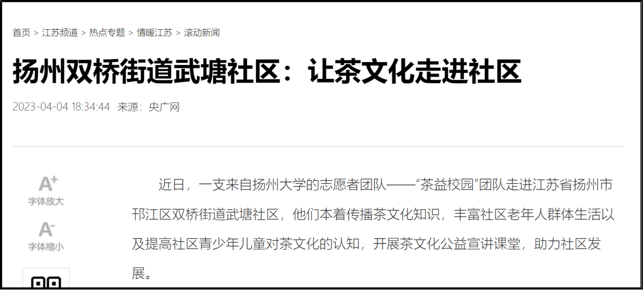 近日,一支来自扬州大学的志愿者团队——“茶益校园”团队走进江苏省扬州市邗江区双桥街道武塘社区,他们本着传播茶文化知识,丰富社区老年人群体生活以及提高社区青少年儿童对茶文化的认知,开展茶文化公益宣讲课堂,助力社区发展。
