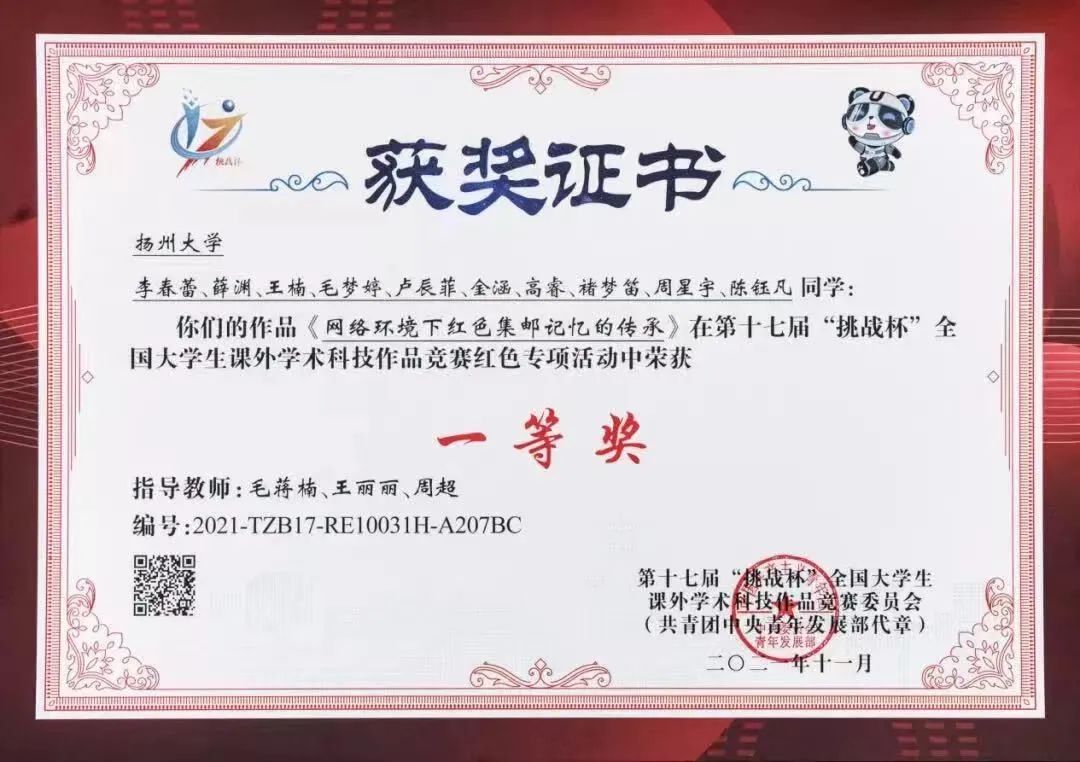 3月28日,第十七届“挑战杯”全国大学生课外学术科技作品竞赛终审决赛落下帷幕,我院毛蒋楠、王丽丽、周超老师指导的“网络环境下红色集邮记忆的传承”项目荣获第十七届“挑战杯”全国大学生课外学术作品竞赛红色专项活动一等奖、最具感染力奖。
