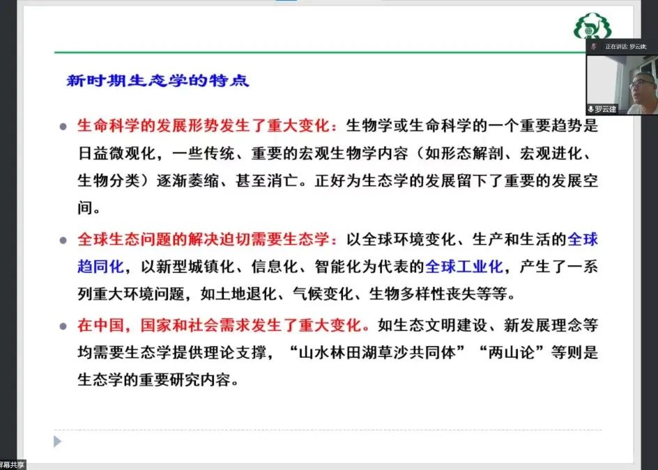 随后,罗云建老师阐述了生态学的重要性,希望同学们掌握生态学的基本原理、知识、技能。通过本次会议,我相信同学们对生态学的了解也更加深入。