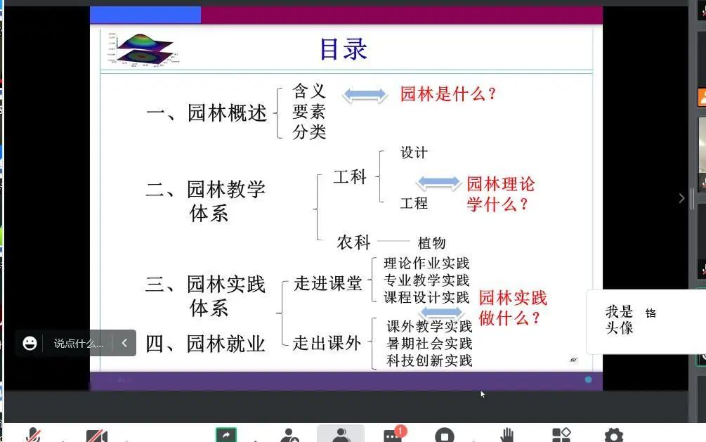 第三期的会议主题是“园林专业人才培养解析”,主讲人陶俊老师从园林是什么、园林理论学什么、园林实践做什么以及园林就业前景四个方面向同学们介绍园林专业,增强了同学们对园林的认知。