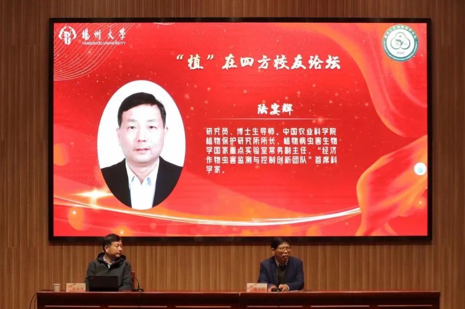 11月11日下午,我院在江阳路北校区毓贤楼报告厅开展了“植”在四方校友论坛,本次活动特别邀请了中国农业科学院植物保护研究所所长陆宴辉校友进行演讲,由院党委副书记魏训鹏主持,23级全体本科生参加。